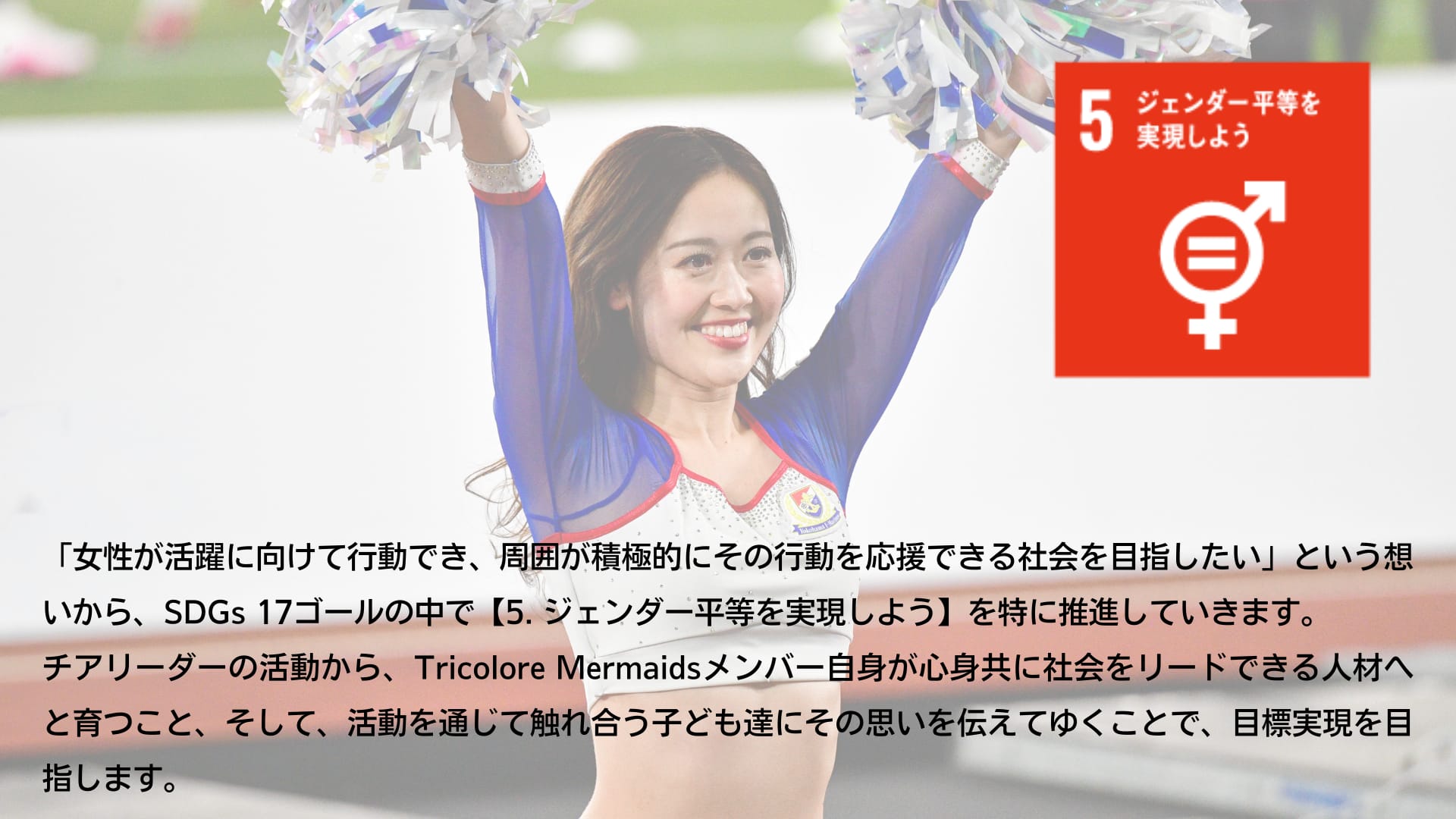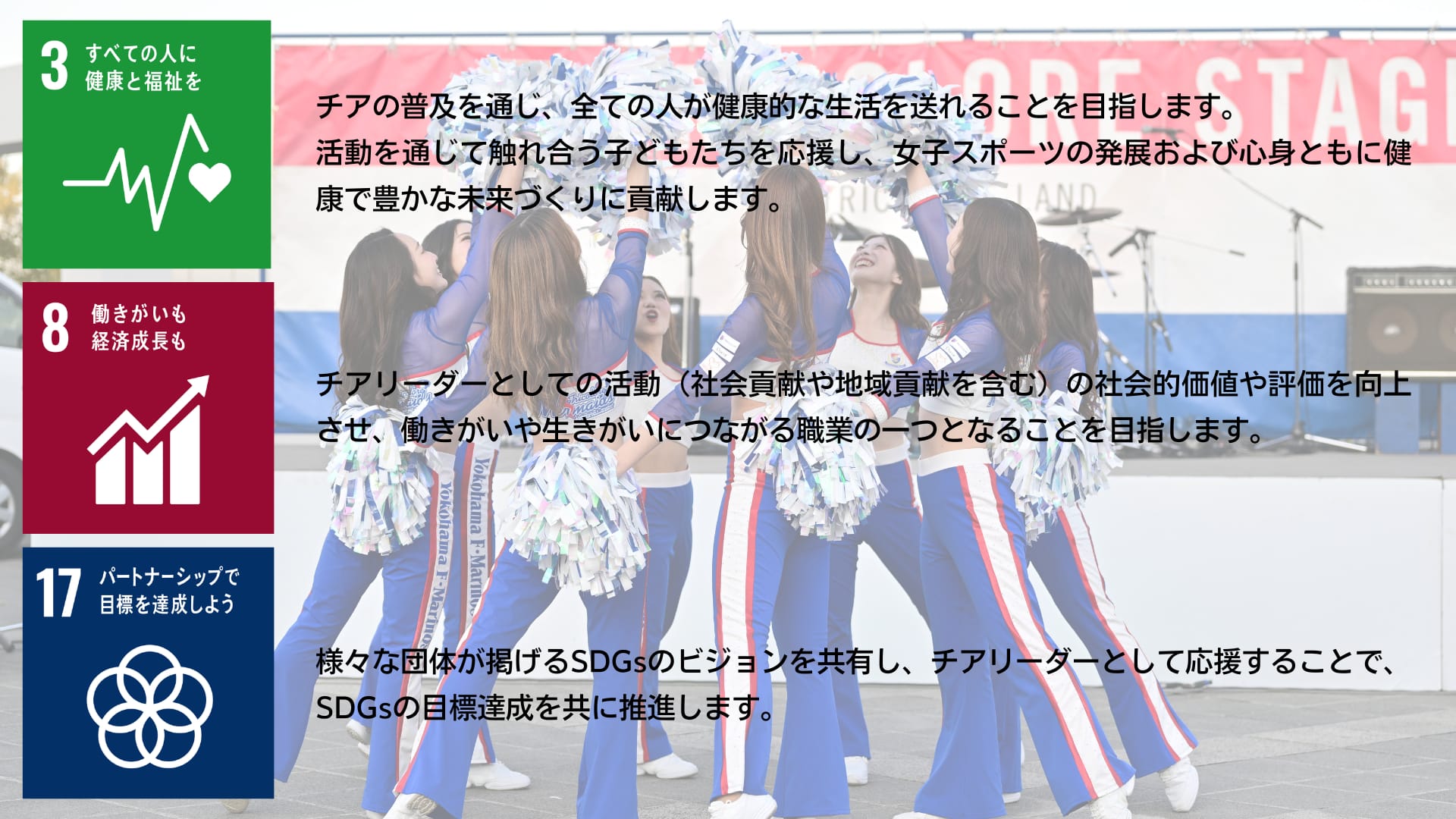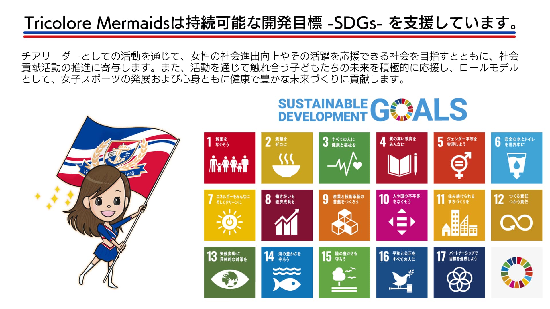 私たち一般社団法人チアリーダーズ協会 横浜F・マリノスオフィシャルチアリーダーズ Tricolore Meramidsは、女性が活躍を目指し行動でき、その行動を周囲が積極的に応援できる社会の実現、スポーツの普及を通じた健康的な未来づくり、女子スポーツの発展を目指しています。同様な目標を持たれている企業をチアリーダーの力を活かし(イベント開催、出演、その他)バックアップすることで、SDGsを広め、目標実現を目指したいと考えています。些細なことからでも、共に考えアイディアを拡げ活動できる企業を募集しています。